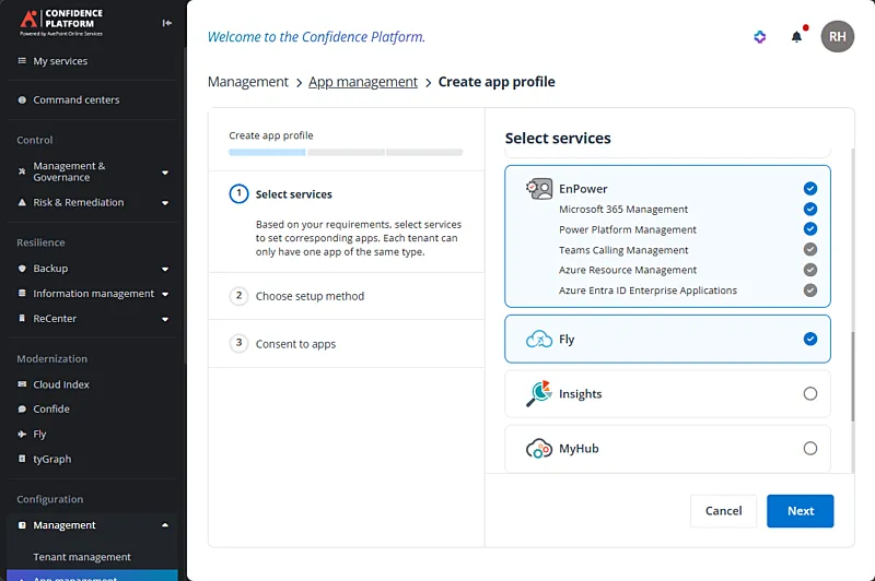 Example: Connecting your AvePoint Tenant to Microsoft 365 by selecting the appropriate workload and application from our list of services.
