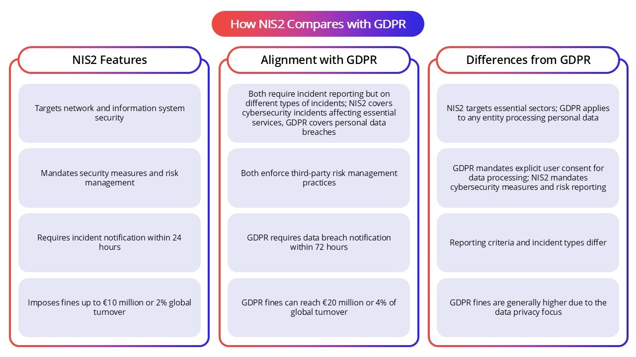 NIS2 shares with GDPR a strong emphasis on data protection and incident reporting but is focused more broadly on network and information system security across critical sectors. Both set out strict requirements for early notification of breaches, but GDPR centers on the privacy of personal data, whereas NIS2 mandates resilience and security measures for essential and important entities.