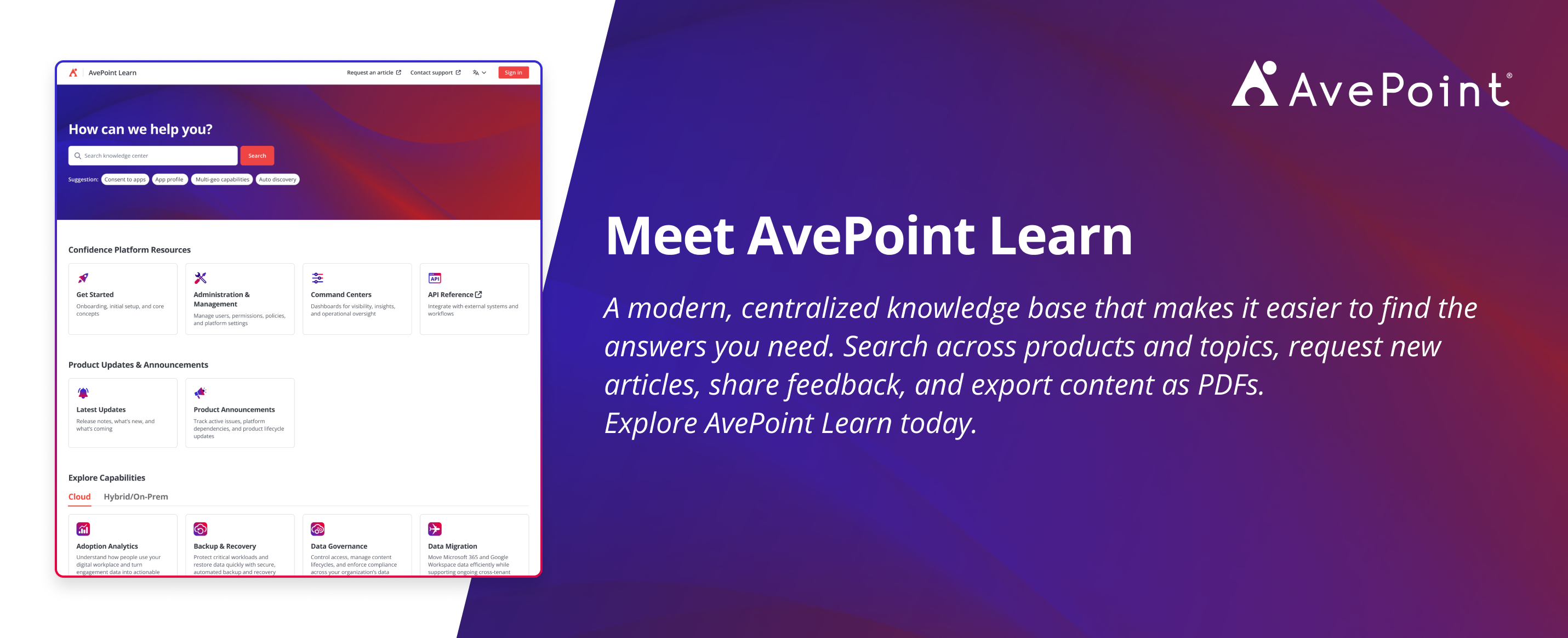 Meet AvePoint Learn, a centralized knowledge base designed to make finding answers faster and easier. Easily search across products and topics, request new articles, share feedback, and export content as PDFs — all from one place. Explore AvePoint Learn.