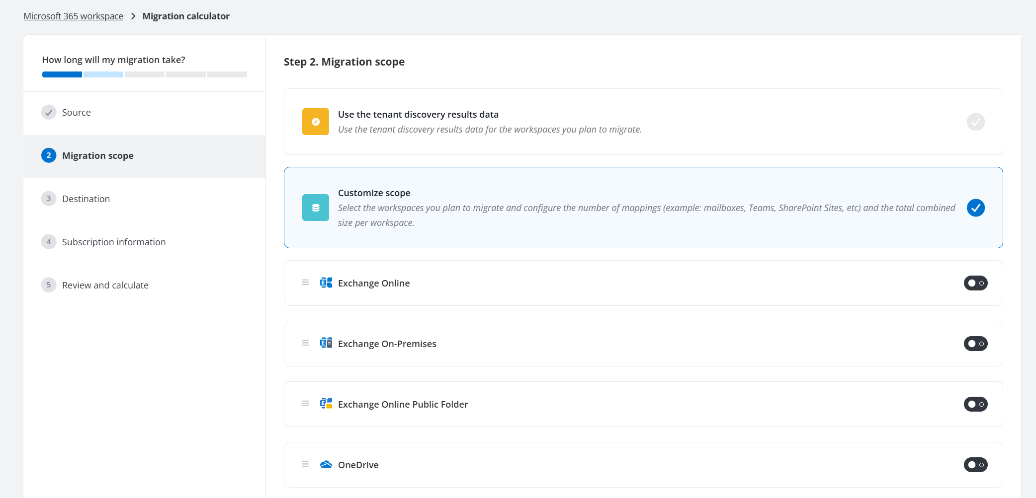 Gain visibility into scope and progress with pre‑migration and in‑progress calculators.