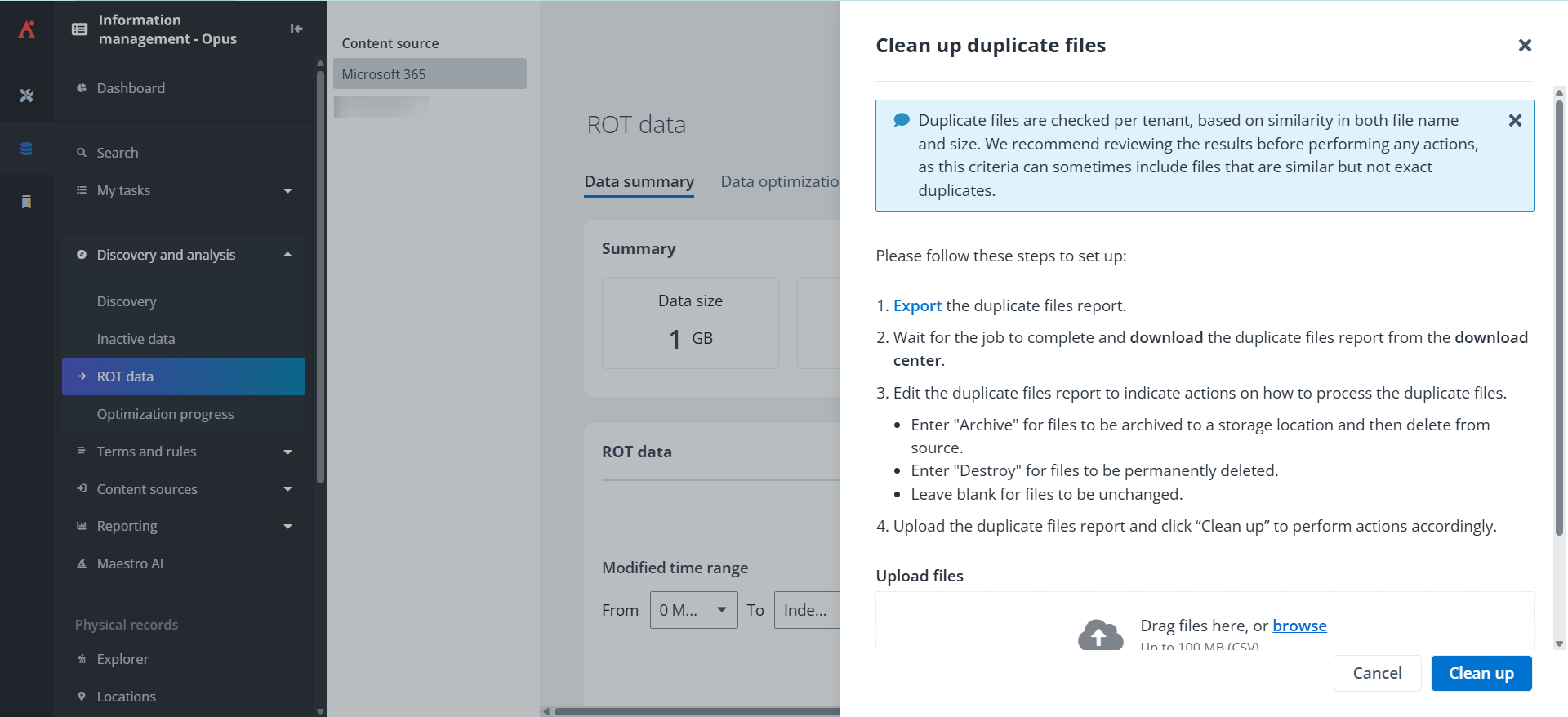 Archived content can now be restored to a user-defined location in SharePoint Online, providing greater flexibility when accessing and reusing content after it’s returned from archival storage. Teams can also take action on duplicate content directly from analysis results, deleting or archiving duplicates in bulk to reduce clutter and storage usage.