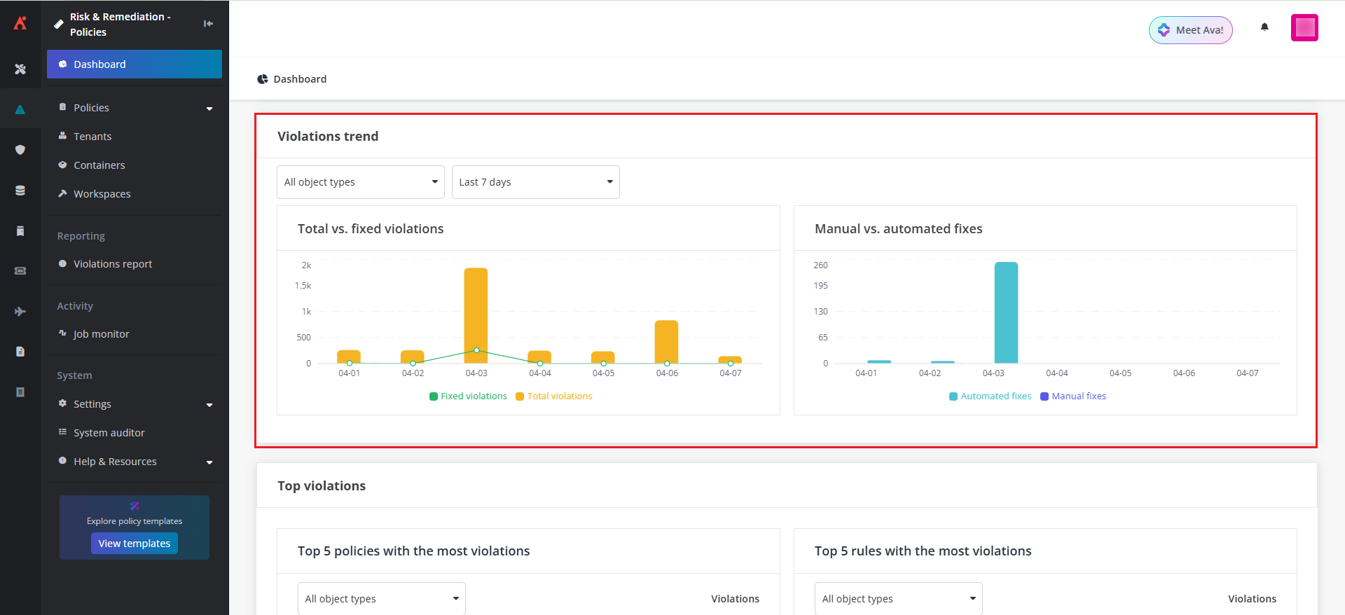 Policies now provides deeper visibility into policy effectiveness with enhanced violation trends on the dashboard. Clearer summaries and trend views make it easier to compare manual versus auto-fixes, filter by activity or object type, and quickly understand detected, resolved, and outstanding violations at a glance.