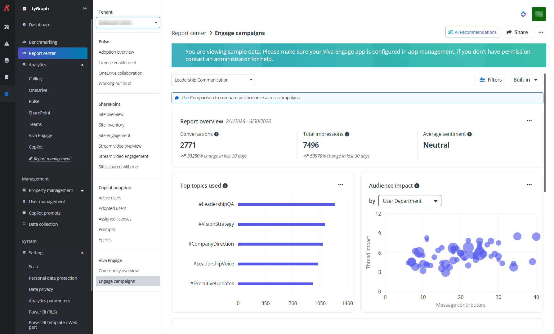 tyGraph adds deeper insight into engagement and governance across Microsoft 365. Engage Campaign Insights for Viva Engage now measure performance based on topics and hashtags, helping communications teams understand what drives engagement, when activity peaks, and which messages resonate most.