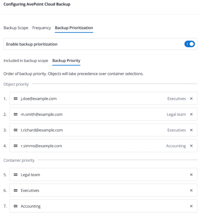 Prioritize backups for containers and objects to ensure essential data is protected first and without delay.