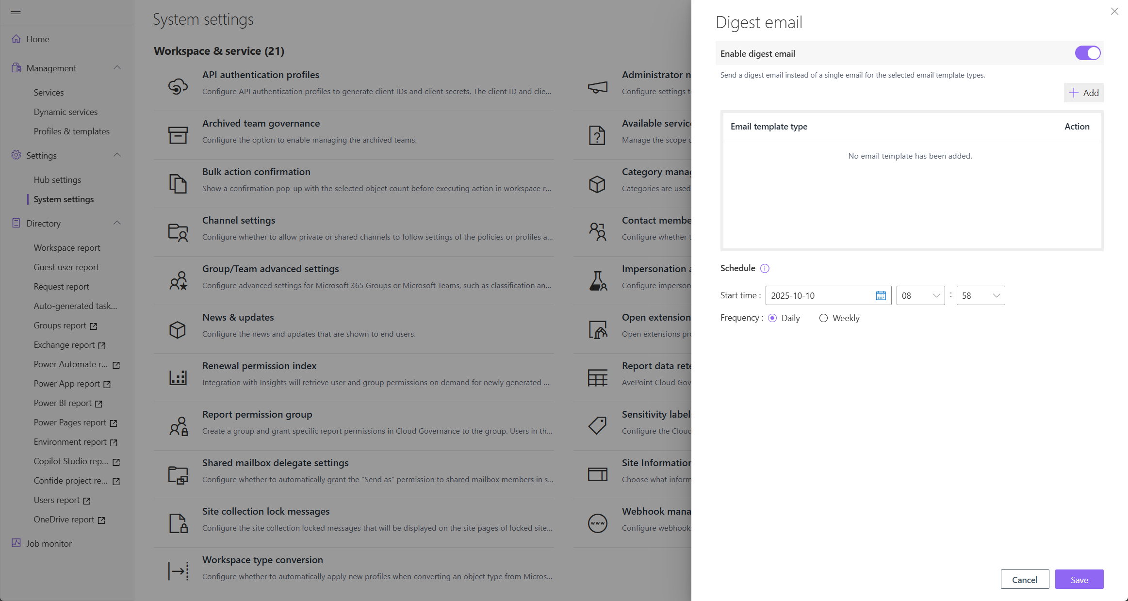 AvePoint Cloud Governance introduces new features that simplify governance workflows, improve automation, and enhance visibility across Microsoft 365. Users now receive digest emails summarizing key tasks, alerts, and updates, reducing inbox clutter while staying informed. Governance for Viva Engage has been expanded with dynamic service support, allowing users to manage community membership and ownership through structured requests. Dynamic metadata branching offers consistent metadata assignment across Change Metadata workflows, with future support planned for renewal and auto-import profiles.