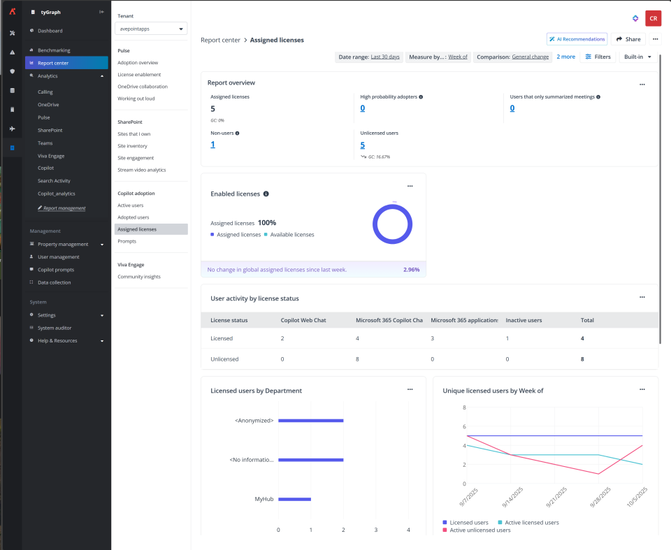 AvePoint tyGraph introduces many enhancements designed to improve visibility, engagement, and decision-making across Microsoft 365 environments. Organizations can now track usage of the free Copilot web chat to identify unlicensed users and benchmark activity, enabling smarter licensing strategies and more accurate adoption insights. Organizations can now track usage of the free Copilot web chat to identify unlicensed users and benchmark activity, enabling smarter licensing strategies and more accurate adoption insights. By first training users to succeed with free Copilot, organizations can pinpoint those who demonstrate meaningful engagement and then upgrade them to paid licenses. This targeted approach reduces wasted spend and accelerates early success.