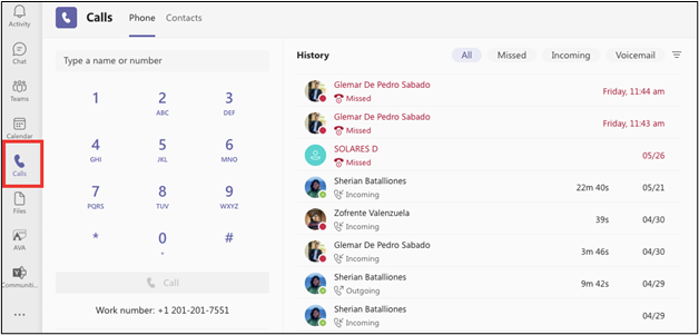 Eine zweite Möglichkeit zum Starten eines Anrufs ist die Registerkarte „Anrufe“, die sich im Hauptmenü auf der linken Seite des Bildschirms befindet. In dieser Registerkarte können Sie mit dem Tastenfeld eine Nummer eingeben oder mit der Suchleiste Ihre Kontaktliste nach der Person durchsuchen, die Sie anrufen wollen. In dieser Ansicht sehen Sie zudem Ihren Anrufverlauf einschließlich aller verpassten Anrufe und Voicemails. Doppelklicken Sie darauf, um einen Anruf zu starten.